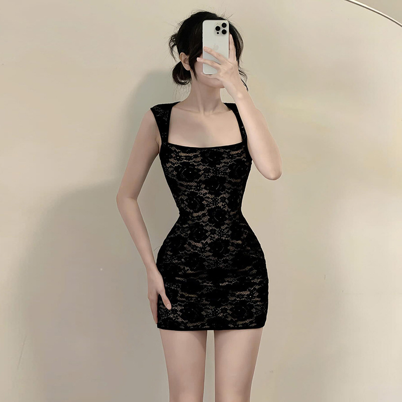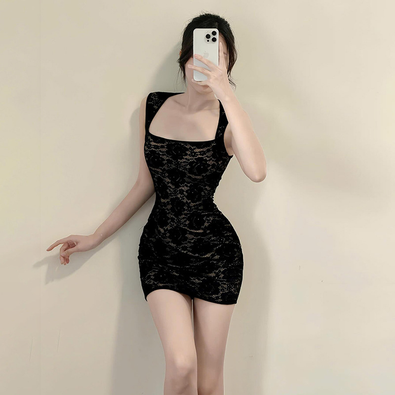 Sexy shoulder bag buttocks see through lace strap pleated dress for women