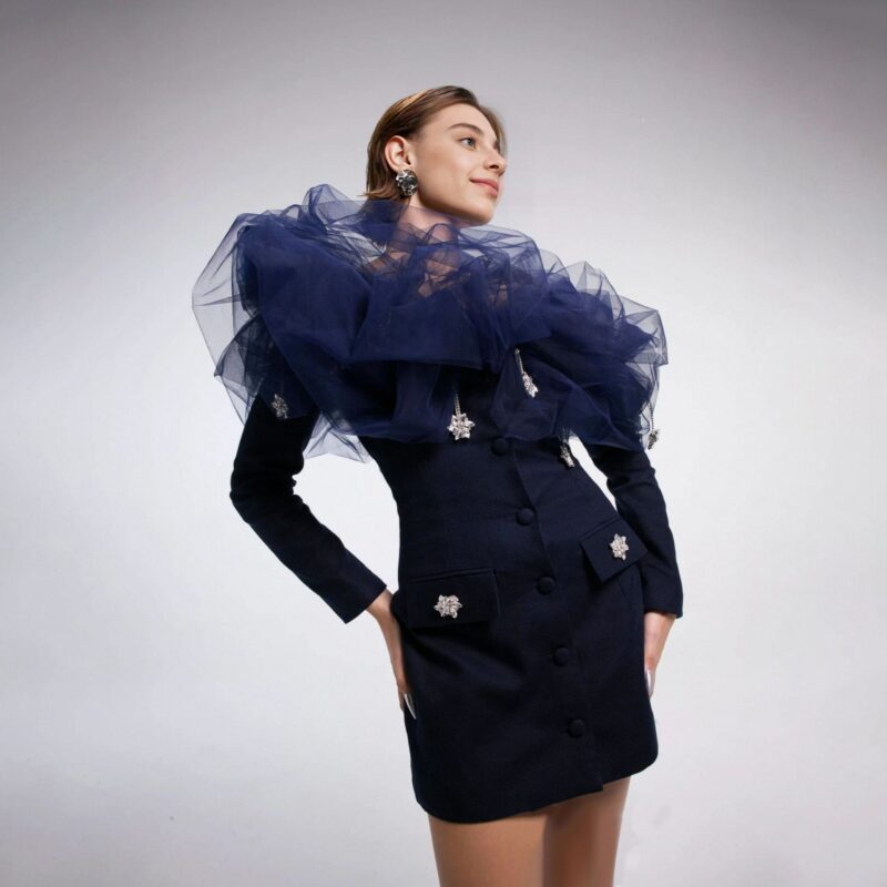 Tibetan blue mesh cloud shoulder diamond pendant solid color dress