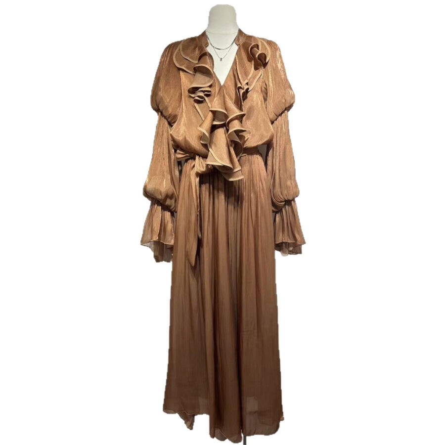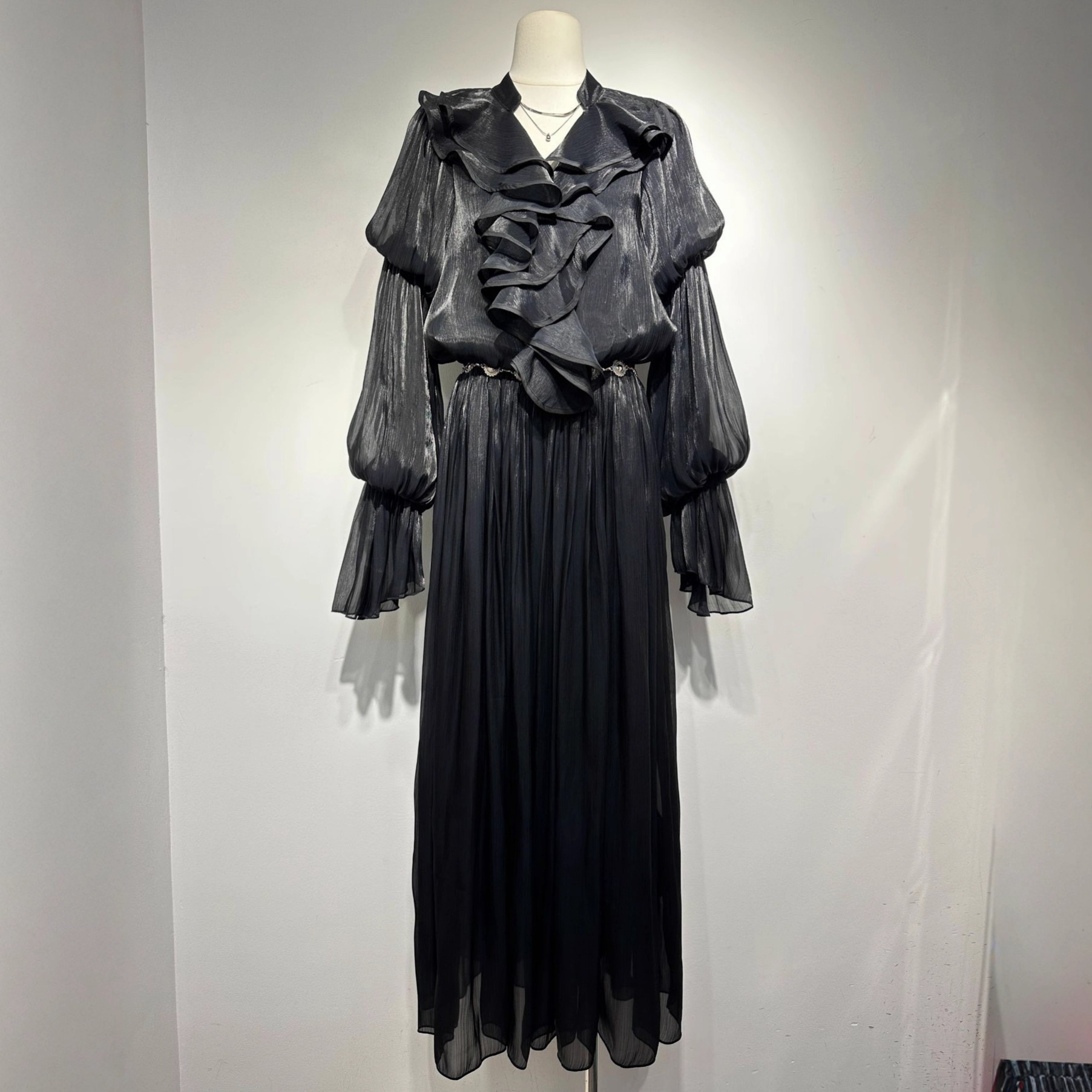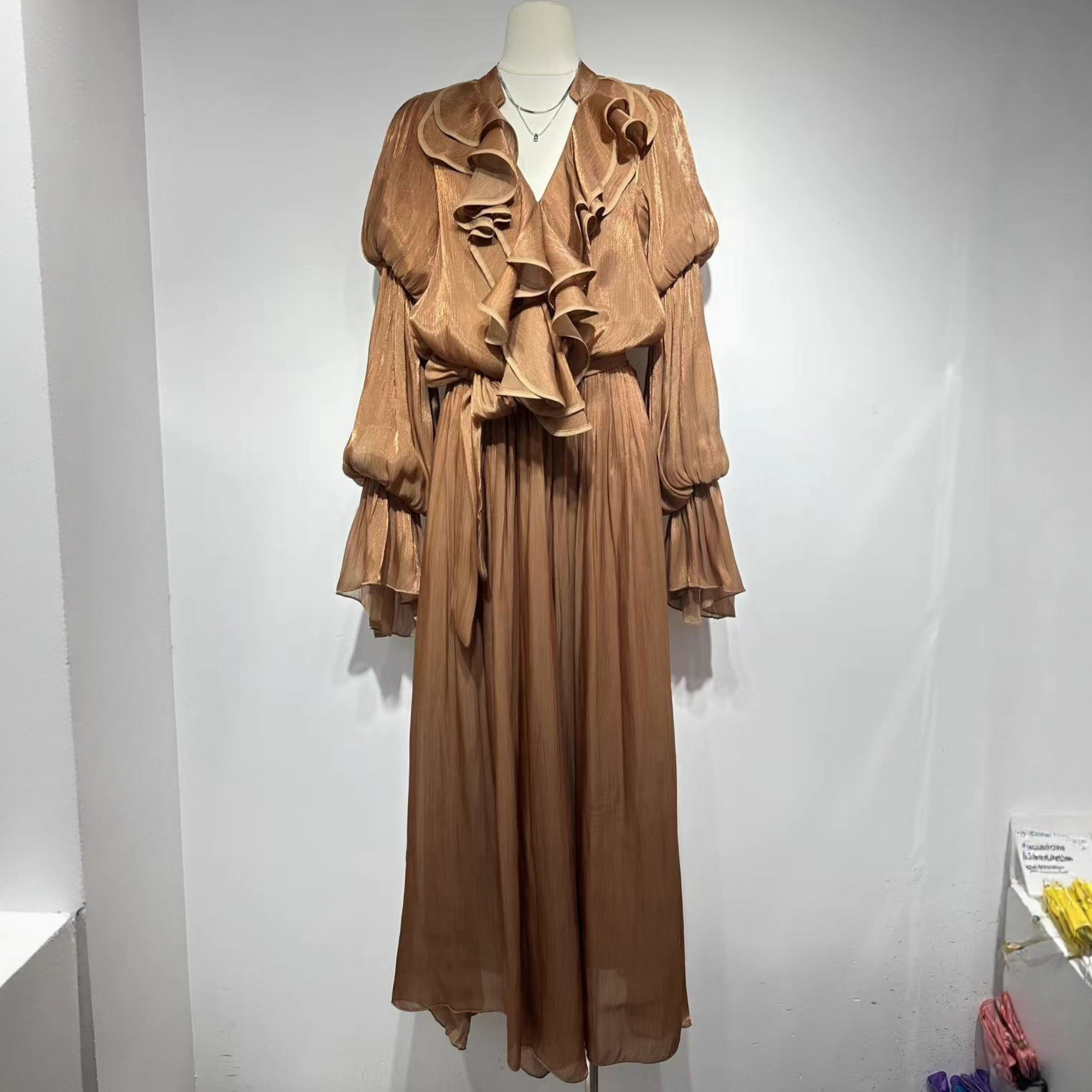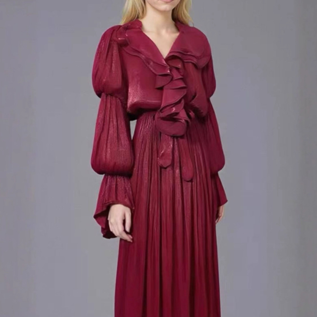 Be the first to review “Ruffle V-neck flared sleeve elegant pleated dress”