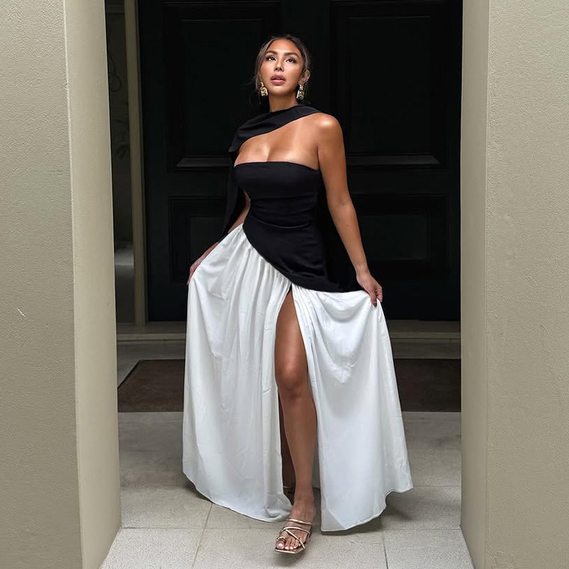 Slimming and slimming color blocked strapless dress