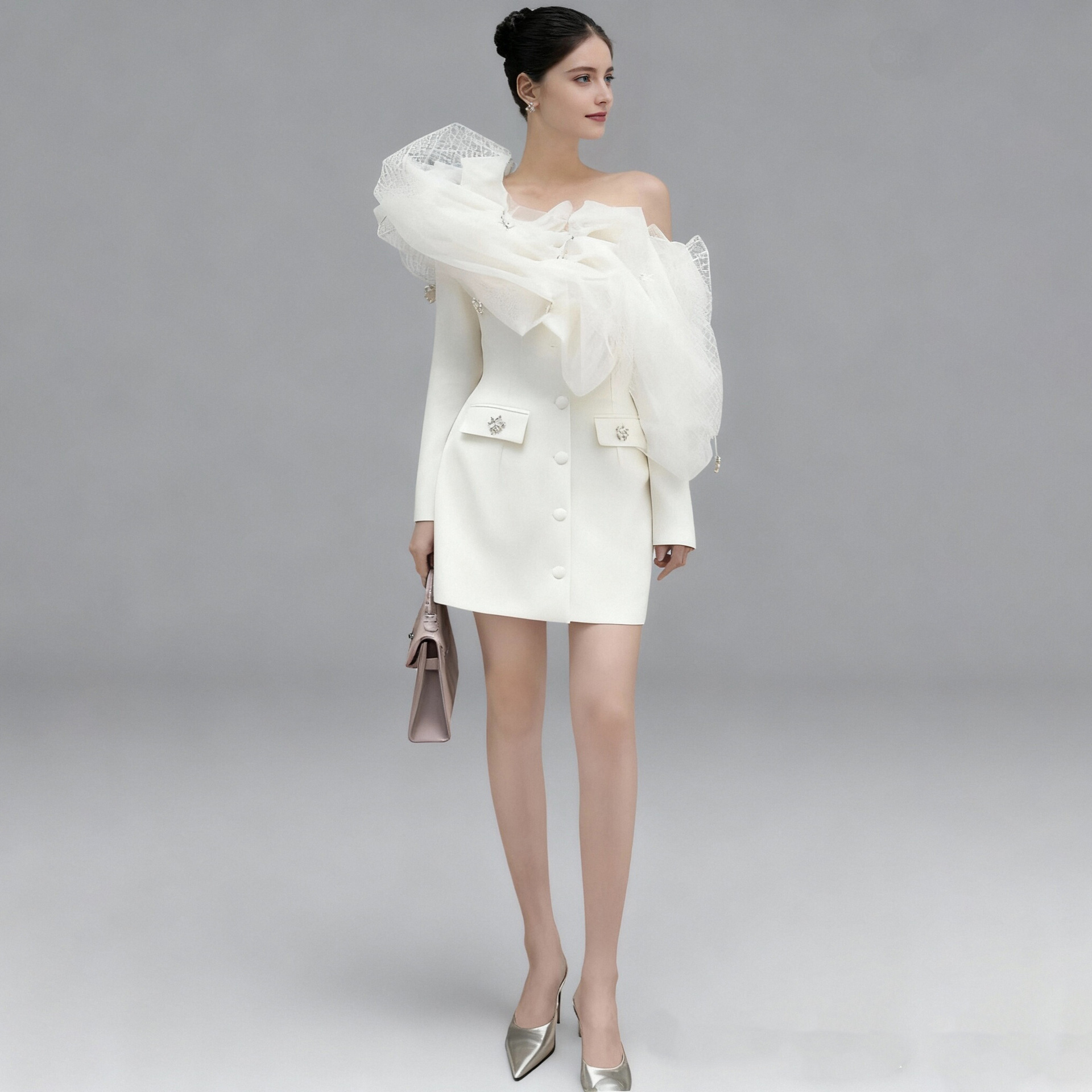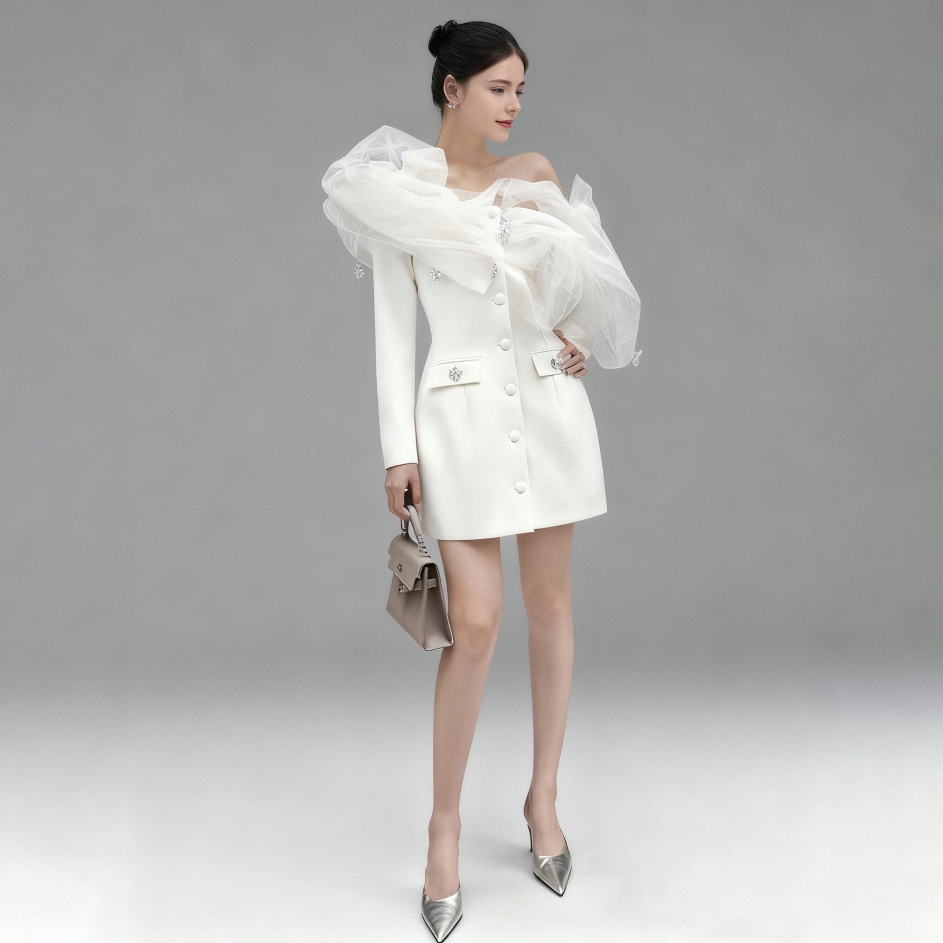 Tibetan blue mesh cloud shoulder diamond pendant solid color dress