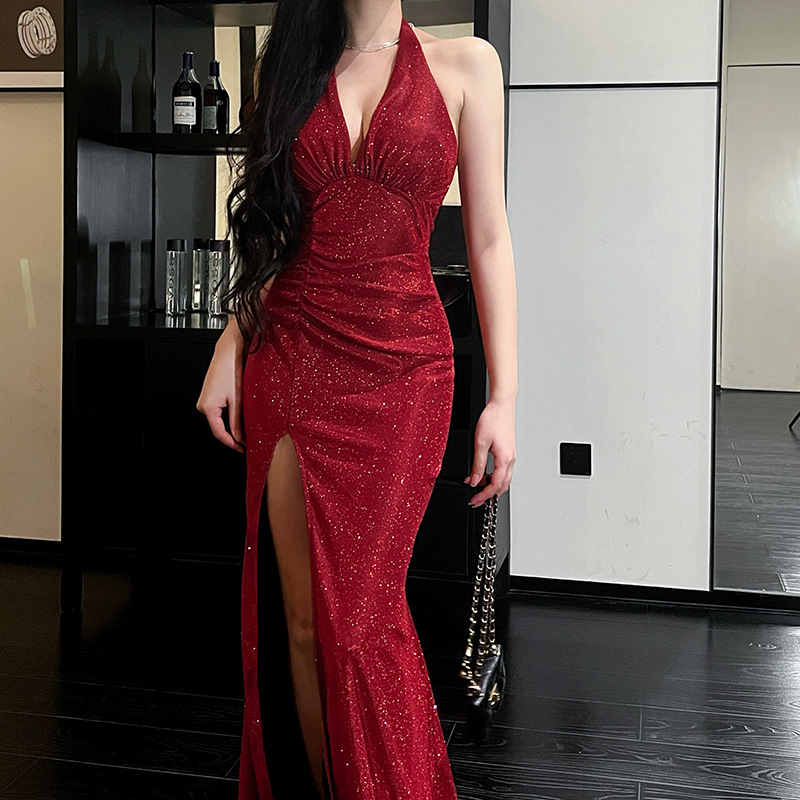 V-neck hanging neck slim flash dress for evening dress